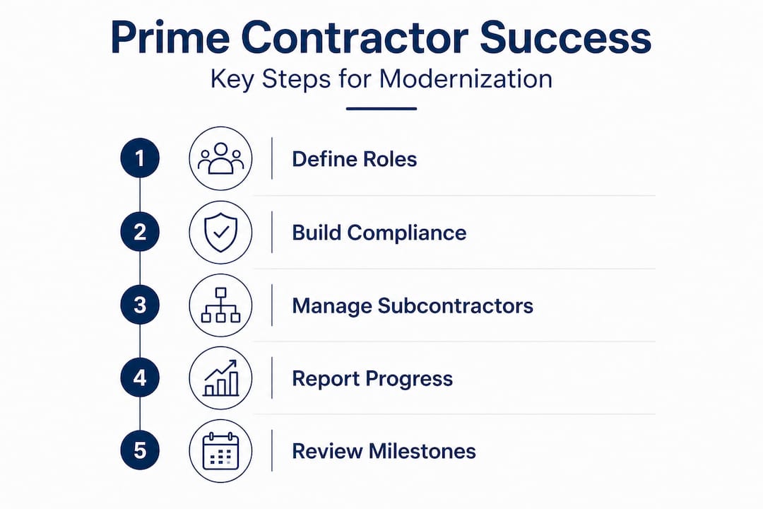 IT modernization best practices require primes to build oversight into the program structure, not treat it as an administrative afterthought. That means regular compliance reviews, documented corrective action processes, and clear escalation paths when a subcontractor falls short.